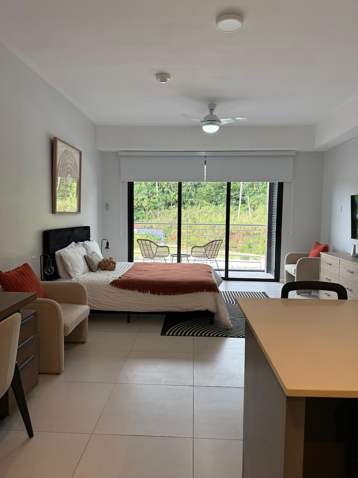 Elegante apartamento estudio en las frescas colinas de Mandeville, que ofrece comodidad moderna con una cama tamaño king, aire acondicionado, cocina totalmente equipada, balcón privado, WiFi rápido, TV inteligente, lavadora/secadora en la unidad, chimenea, espacio de trabajo dedicado, futón, piscina y gimnasio. Ubicado en el centro, cerca del corazón de la ciudad, con fácil acceso a tiendas, restaurantes y parques. Cuenta con llegada autónoma segura + estacionamiento gratuito en el lugar, en un tranquilo complejo de apartamentos cerrado, ideal para trabajar o relajarse en un entorno tropical tranquilo.