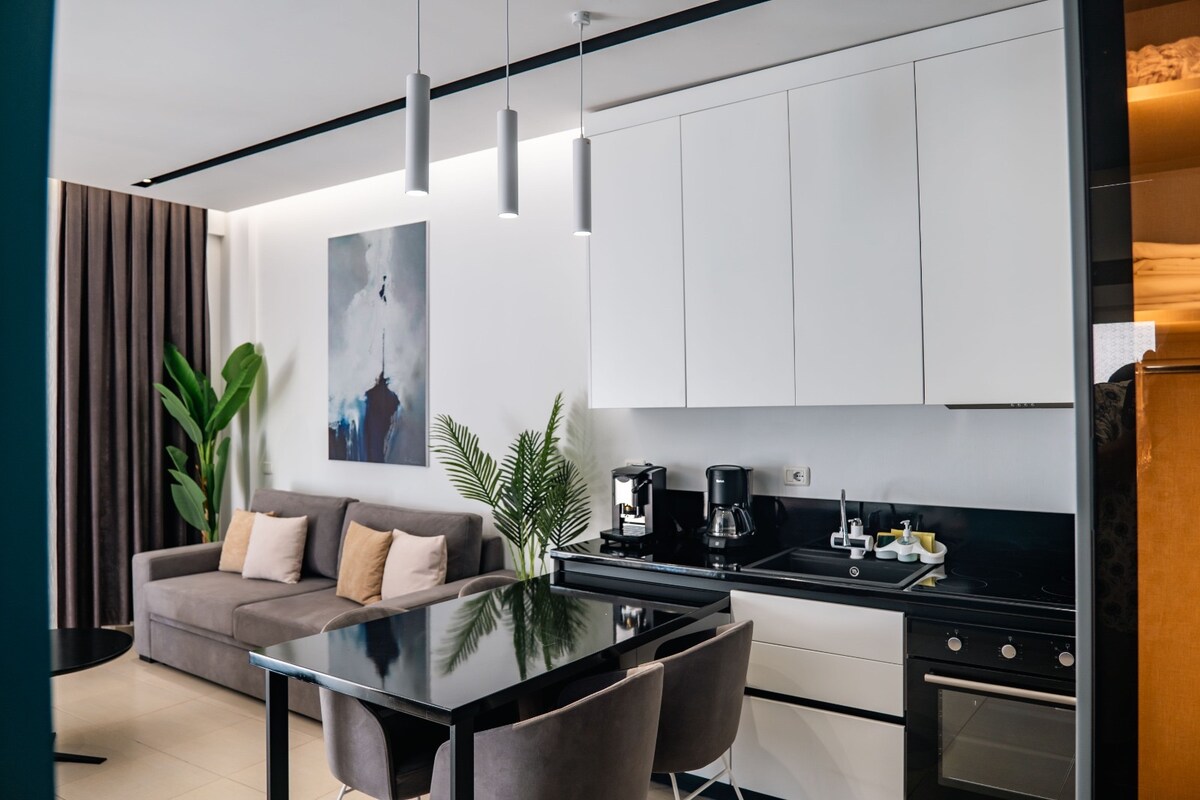 Luxurious, stylish and modern suite with beach view. This open-space suite has a unique style.