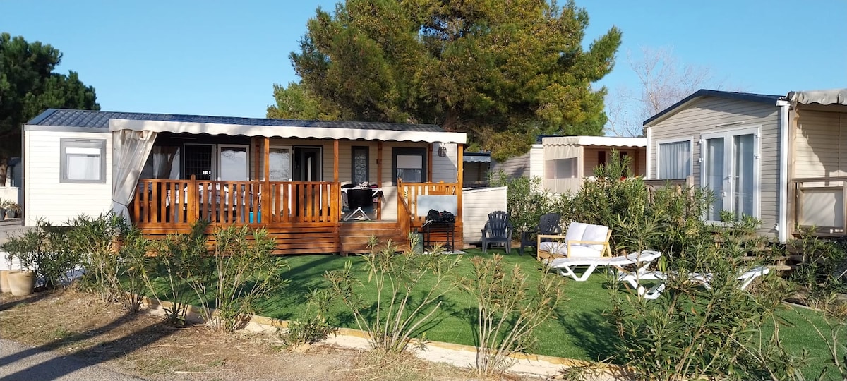 Magnífica casa móvil en un pueblo de vacaciones de 4 estrellas (el mar Estang). El pueblo de vacaciones está idealmente situado entre el mar y la montaña, en la frontera de España, situado entre la playa, el estanque y la reserva natural. La casa móvil está a 50 metros de la playa y tiene acceso directo. La casa móvil es nueva, moderna y está muy bien equipada. Tiene una gran terraza en la que se pueden pasar noches cálidas y agradables. fun pass piscina y ropa de cama no incluidos.
