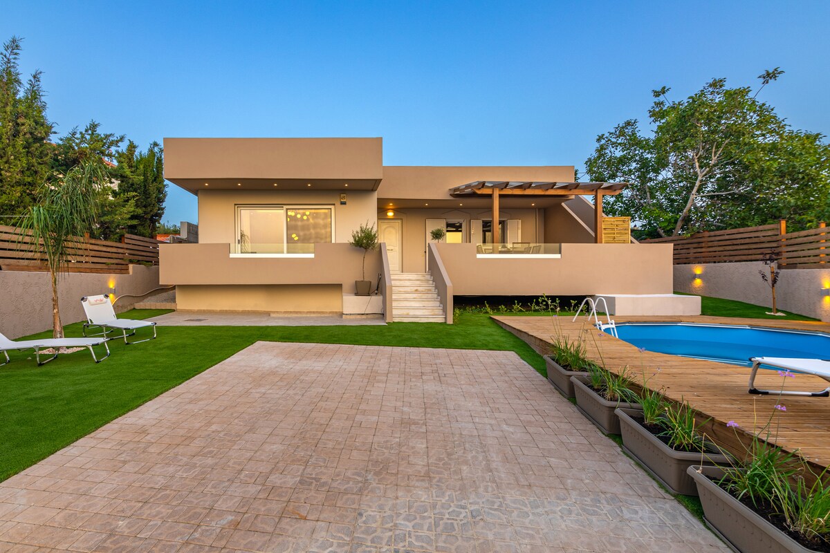 Olvídate de tus preocupaciones en este espacio espacioso y sereno. Solo relájate en el jacuzzi o en la piscina y disfruta de la puesta de sol perfecta. A solo 15 minutos de la ciudad de Heraclión, "Vasilies", es el mejor lugar para combinar montaña y mar en la isla de Creta. La propiedad te ofrece todas las instalaciones con internet de alta velocidad y TV de 60 pulgadas, 3 inodoros y baños totalmente equipados para que pueda satisfacer a los huéspedes más exigentes. Todo es nuevo y moderno al darle al espacio una sensación de vida hogareña