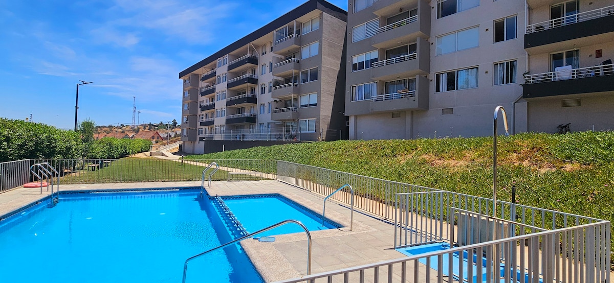 Disfruta de un descanso reparador en un lugar pensado para ti. Departamento completamente equipado con todos los servicios necesarios. Pueden descansar cómodamente 4 personas. 2 habitaciones con 2 baños . Lugar totalmente céntrico y conexión a Viña del Mar e Interior de la 5 ta región. Puedes acceder al uso de la piscina en termporada.