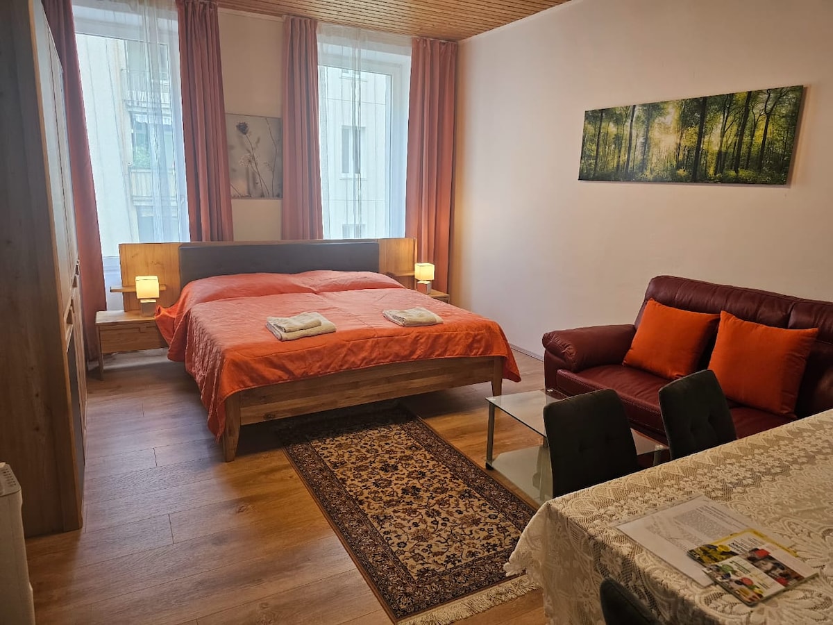 Entra en la comodidad de tu elegante apartamento en la azotea bañado por el sol, con excelentes instalaciones en el centro de Viena. A solo unos pasos de la vibrante Radetzkyplatz y del río Danubio, el apartamento promete un refugio urbano, a poca distancia a pie de los mejores restaurantes, tiendas, atracciones y lugares de interés de la ciudad. ¡La auténtica vida vienesa en todo su esplendor! Cama tamaño✔ king + sofá cama Sala ✔ de estar de planta abierta. Cocina ✔ Totalmente Equipada Balcón ✔ privado. ✔ Smart TV Wifi de✔ alta velocidad ✔ Aire acondicionado Más información ↓