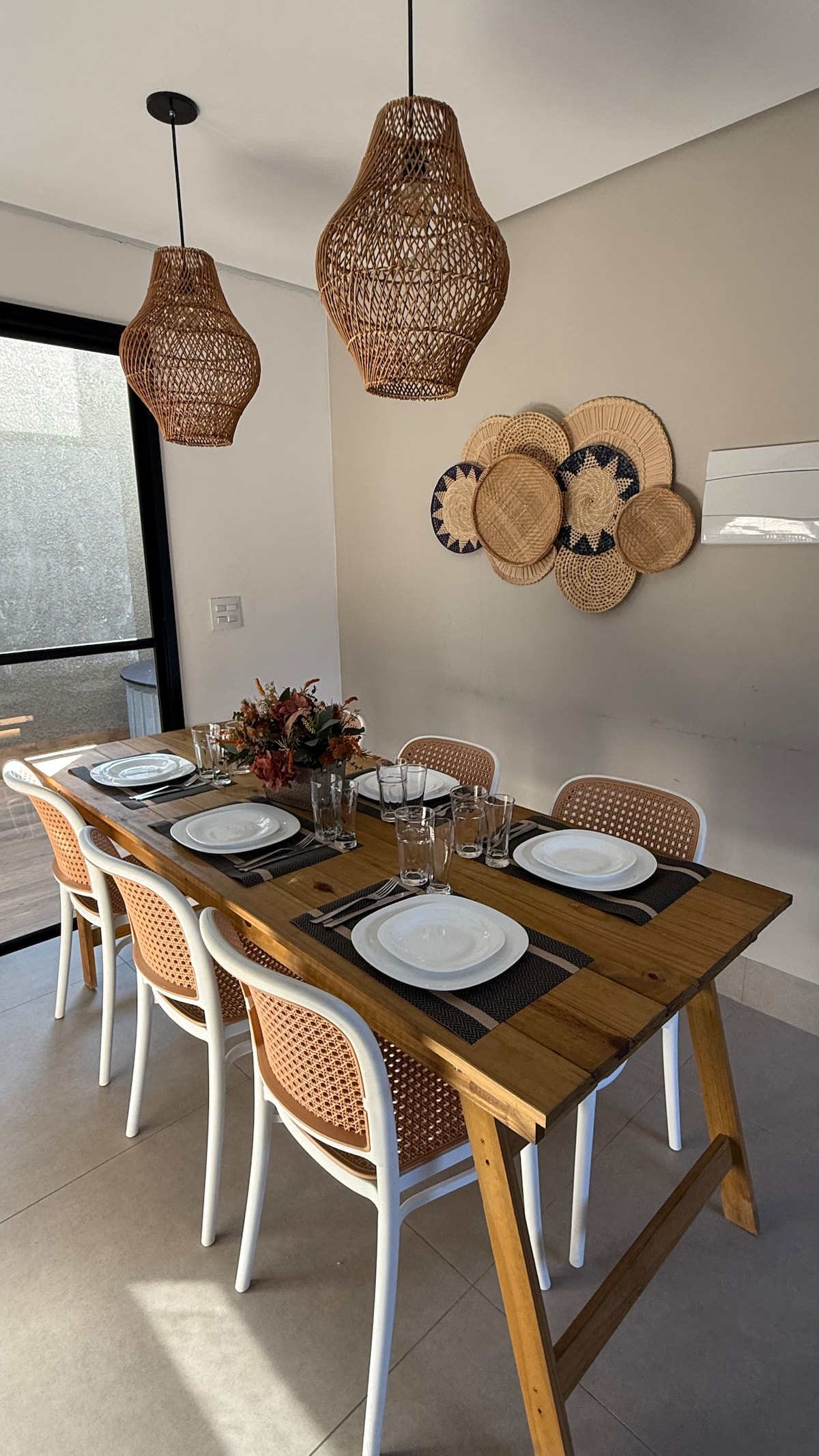 Casa en condominio cerrado, seguro, reformado. 1• Piso: 2 dormitorios con aire acondicionado (cama queen + cama individual (litera) + colchón auxiliar (piso), sala de estar y baño. No ofrecemos toallas ni artículos personales. Todos los colchones y almohadas tienen funda. 2• piso: cocina completa (todos los utensilios básicos), comedor, gran balcón con barbacoa y baño. *tenemos un enchufe de 42/20 amperios en el espacio del garaje, para cargar 🚗 eléctricos.
