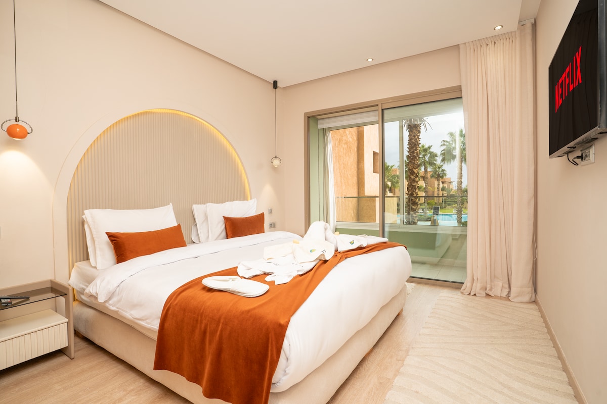 Apartamento contemporáneo en el corazón de Marrakech, situado en la prestigiosa Résidence Prestigia, segura y al lado de un campo de golf. Con una ubicación ideal: a 5 minutos del aeropuerto y del centro de Menara, a 9 minutos de Jamaa el Fna. La residencia ofrece zonas verdes, un lago y un parque infantil. El apartamento dispone de terraza con jacuzzi y vistas a la piscina, 2 cómodos dormitorios, cocina equipada, sala de estar con Netflix y aire acondicionado. ¡Lujo y serenidad para una estancia perfecta!