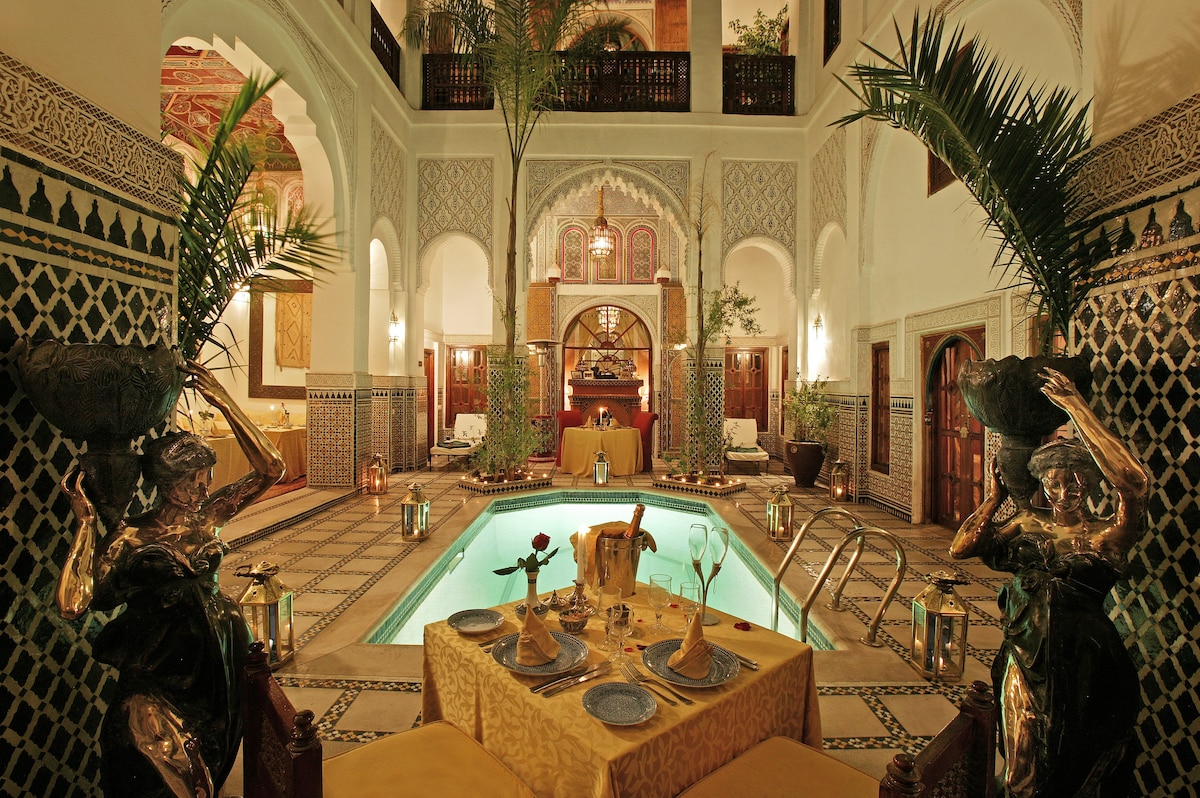 The Scheherazade Suite. Escape to a charming boutique hotel riad in the heart of the Medina, just a short walk from Jemaa El Fna Square. Immerse yourself in pure Marrakchi tradition, with elegant decor, air-conditioned rooms, fast WiFi, and a refreshing plunge pool. Enjoy daily breakfast & housekeeping, plus a stunning rooftop terrace for evening drinks and dinner under the stars. A peaceful retreat with all modern comforts—book your authentic Marrakech experience today!