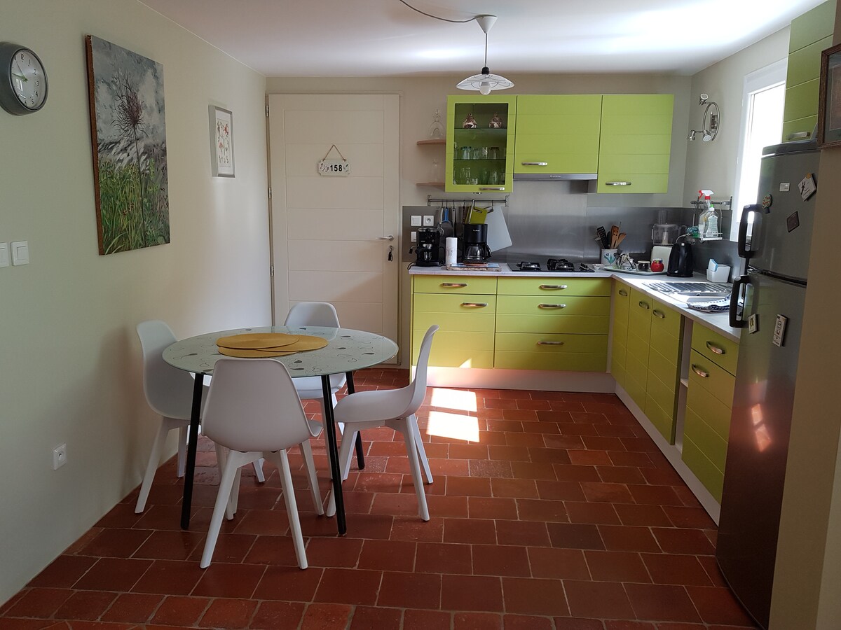 Una casa pequeña en el corazón de la Gascuña. De una sola planta, con aire acondicionado, equipada y cómoda, con capacidad para 4 personas que consta de una habitación principal con sofá cama para 2, una cocina totalmente equipada y amueblada, cuarto de baño con gran ducha, dormitorio con cama doble de 140x200, sábanas y toallas incluidas y un lavadero con lavadora. Este alojamiento es individual e independiente con una terraza exterior privada y equipada con muebles de jardín. Aparcamiento privado y seguro.