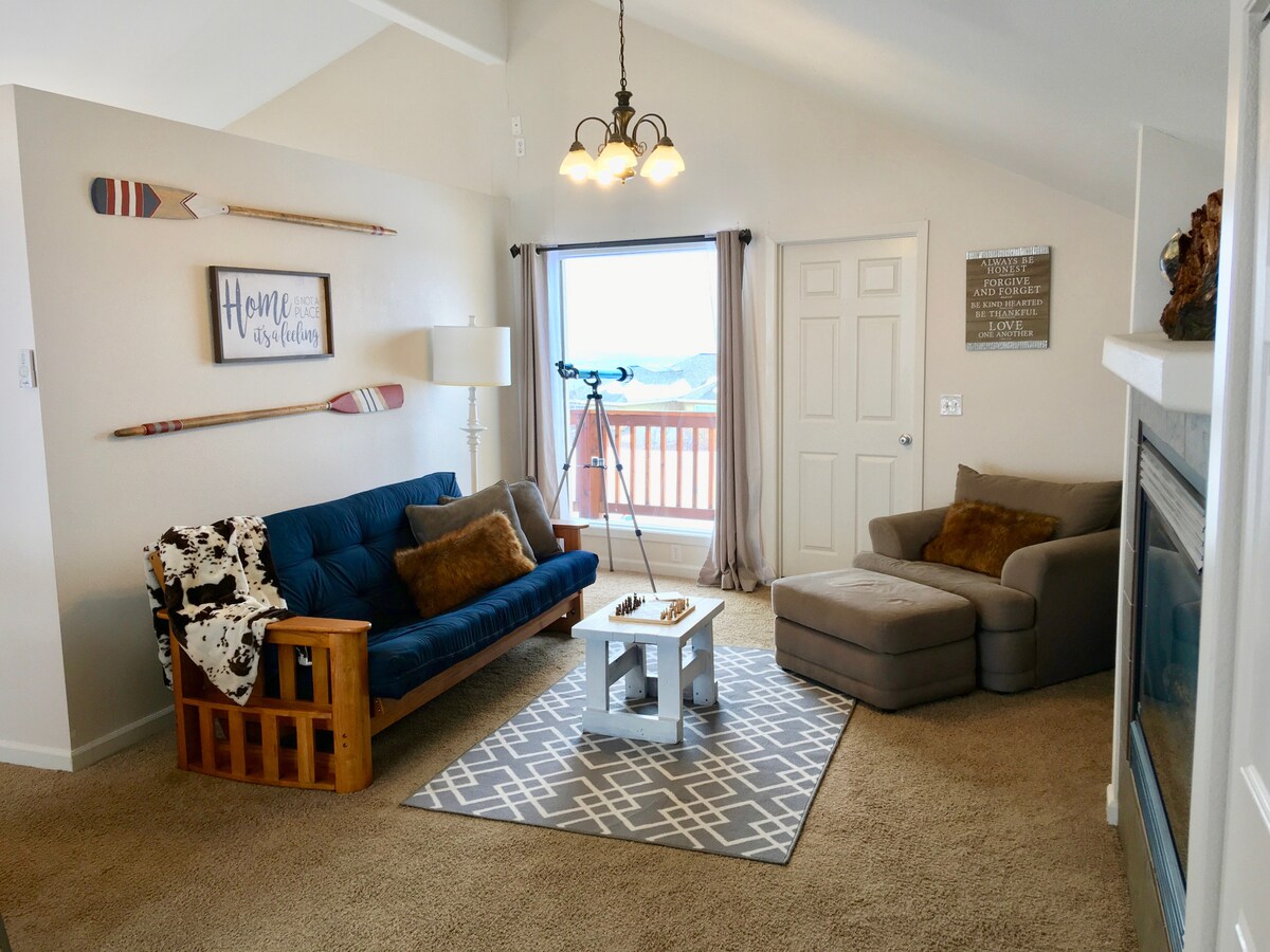 Twin Peaks Chalet tiene capacidad para 6 en 3 camas tamaño queen con cocina completa, sala de estar y mesa de comedor para 6. Accesible para personas con discapacidad en el primer piso sin escaleras, puertas extra anchas, barras de sujeción en el baño. La cocina está totalmente equipada con todo lo que necesitas para preparar tus comidas. El dormitorio principal tiene 2 alturas para la cama con uso ajustable del espacio. No te olvides del loft con 2 camas queen. Disfruta del ambiente tranquilo y las vistas panorámicas, lo que la convierte en una estancia inolvidable.
