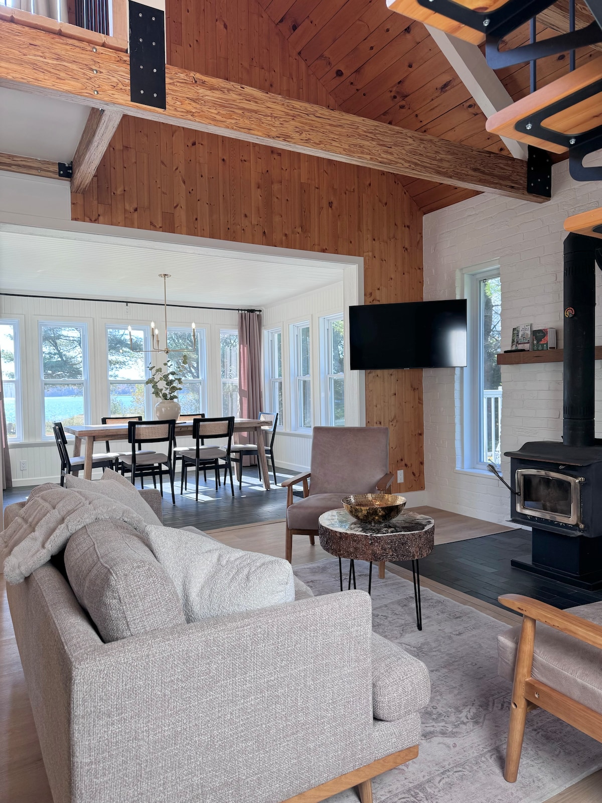A modern lake-view chalet in warm wood. East-facing windows let the soft morning light on heated floors and natural materials. Spread across three levels, the layout offers privacy and room to unwind. In the evening, a cozy cinema with rich sound and an indoor fireplace, a second cinema ideal for music and a turn table. Outdoors, a hot tub, a wood-burning sauna, and a private slide. Cross-country ski, snowshoe trails are minutes’ walk, and snowmobile routes start right at the driveway.