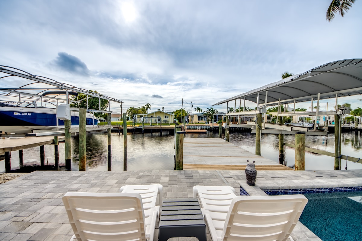 ¿Te gustaría nadar, relajarte al aire libre, pescar y disfrutar de hermosas puestas de sol en un amplio canal de acceso al golfo? Si es así, ¡te enamorarás de esta impresionante casa de nueva construcción hecha a medida! La casa de 2750 pies cuadrados es luminosa y espaciosa, con dos dormitorios principales en suites y un ala familiar separada. ¡La cocina gourmet, el comedor y la gran sala se abren a través de grandes ventanales al lanai y la piscina con vistas al canal en el muy deseado suroeste de Cape! ¡Villa inspirada en la playa! ¡Gran paseo de capitanes y Tiki! ¡Echa un vistazo a nuestras evaluaciones!