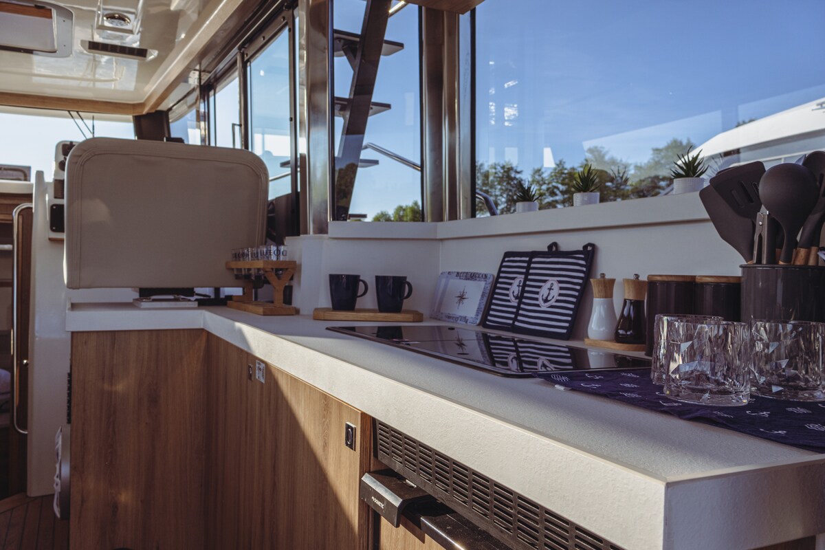 Alquila una casa flotante Lamdo Yachts LY30+ con 6 camas. Este es el último modelo 2023. Equipo: - Radio BLUETOOTH con altavoces perfectos y retroiluminados de 1300W HERTZ (altavoces, subwoofer, amplificador) - Cocina totalmente equipada con estufa de gas, lavabo, nevera con congelador. - una mesa de comedor plegable y un bar plegable. - 3 terrazas grandes (paja, arco, techo) - Ducha alta y espaciosa e inodoro separado.