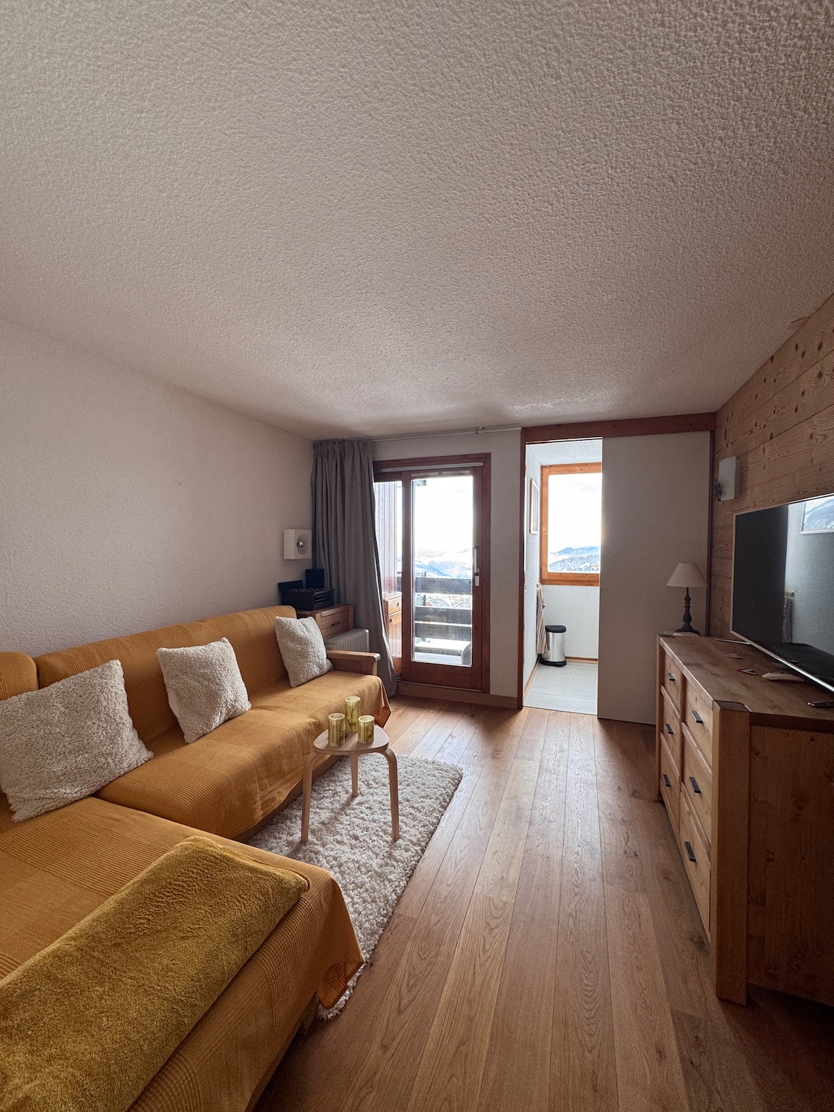 Top vue, Ski aux pieds, résidenceTueda. Studio refait à neuf, nombreux rangements. Couchage salon canapé 2 matelas épais se glissant à niveau pour faire 1 lit double 160 face à la vue, rideaux occultants, porte entre séjour & coin montagne de l’entrée avec rideau faisant office de chambre, salle de bains avec baignoire et meuble de rangement, télé Frame au mur. Parquet, menuiseries, état impeccable. Casier à ski. Centre ville direct accessible via ascenseur. Esf jardin d’enfant en bas. ATMJouber