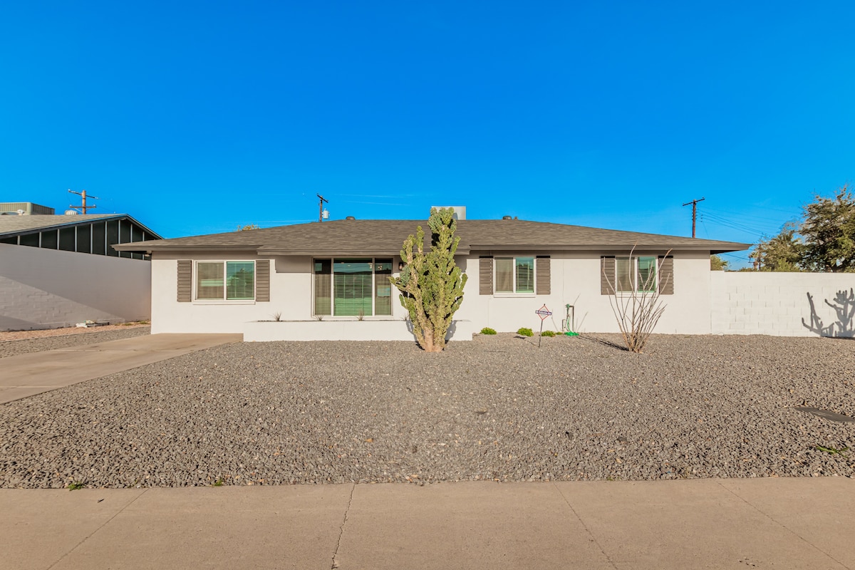 ¡Te damos la bienvenida a Tempe! Esta casa de 2 dormitorios y 1 baño tiene todo lo necesario para una estancia relajante. Totalmente equipada con iluminación inteligente regulable y altavoces en todas las habitaciones, con una cocina recientemente remodelada y un baño que cuenta con una experiencia similar a la de un spa en la bañera de inmersión, lavandería en la unidad, internet de alta velocidad, TV 4K de 86 pulgadas (todas las principales plataformas de streaming y colección de más de 300 películas, con sonido envolvente 5.1.4) incluida y un patio trasero privado. Esta casa es perfecta para un viaje rápido a la ciudad, una noche de cine o un día de vacaciones en el patio trasero.