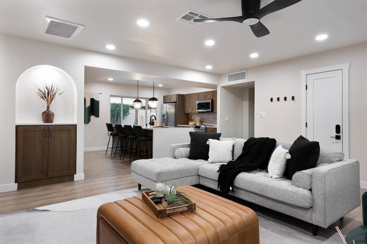 Airlume Stays presenta: The Hayden, un oasis diseñado para el espíritu creativo. Aloja a todas tus personas favoritas: 6 dormitorios/3 baños con un total de 10 camas Beautyrest con la parte superior acolchada, a pocos minutos del casco antiguo de Scottsdale, Spring Training y PHX. El día perfecto te espera: mañanas tardías acurrucadas en sábanas de lujo, noches suaves relajándote en el spa con chorros y piscina climatizada y noches haciendo s'mores junto a la hoguera. Ven a reconectarte y rejuvenecer en este alojamiento parisino-sonorense.