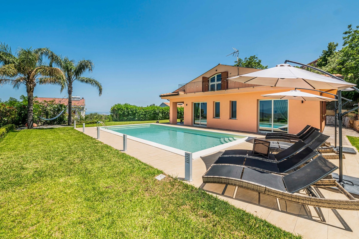 Villa Caterina está situada en una roca panorámica con impresionantes vistas de 360 grados del mar, las islas Eolias y las colinas circundantes. Cuenta con piscina privada equipada, terrazas panorámicas, cenadores a la sombra, jardines cuidados y espacios al aire libre exclusivos. Esta encantadora villa, con 4 dormitorios, 2 baños, una amplia cocina totalmente equipada y una sala de estar con TV de 60 pulgadas, es el lugar perfecto para unas vacaciones de lujo en Sicilia.