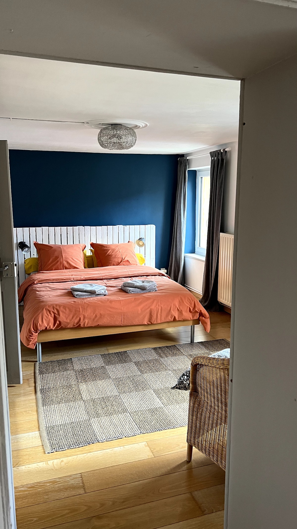 Un apartamento elegantemente amueblado en el segundo piso de nuestro edificio de apartamentos: 2 dormitorios cada uno con una cama doble, baño con ducha, sala de estar grande con sofá cama. Un comedor para 6 personas y una cocina totalmente equipada. Incluye wifi y SmartTV. Un estacionamiento público gratuito junto a la casa. A 15 minutos en auto de la capital. Hay una parada de autobús justo enfrente de la casa. Soy muy accesible como anfitrión porque vivo en el mismo edificio.