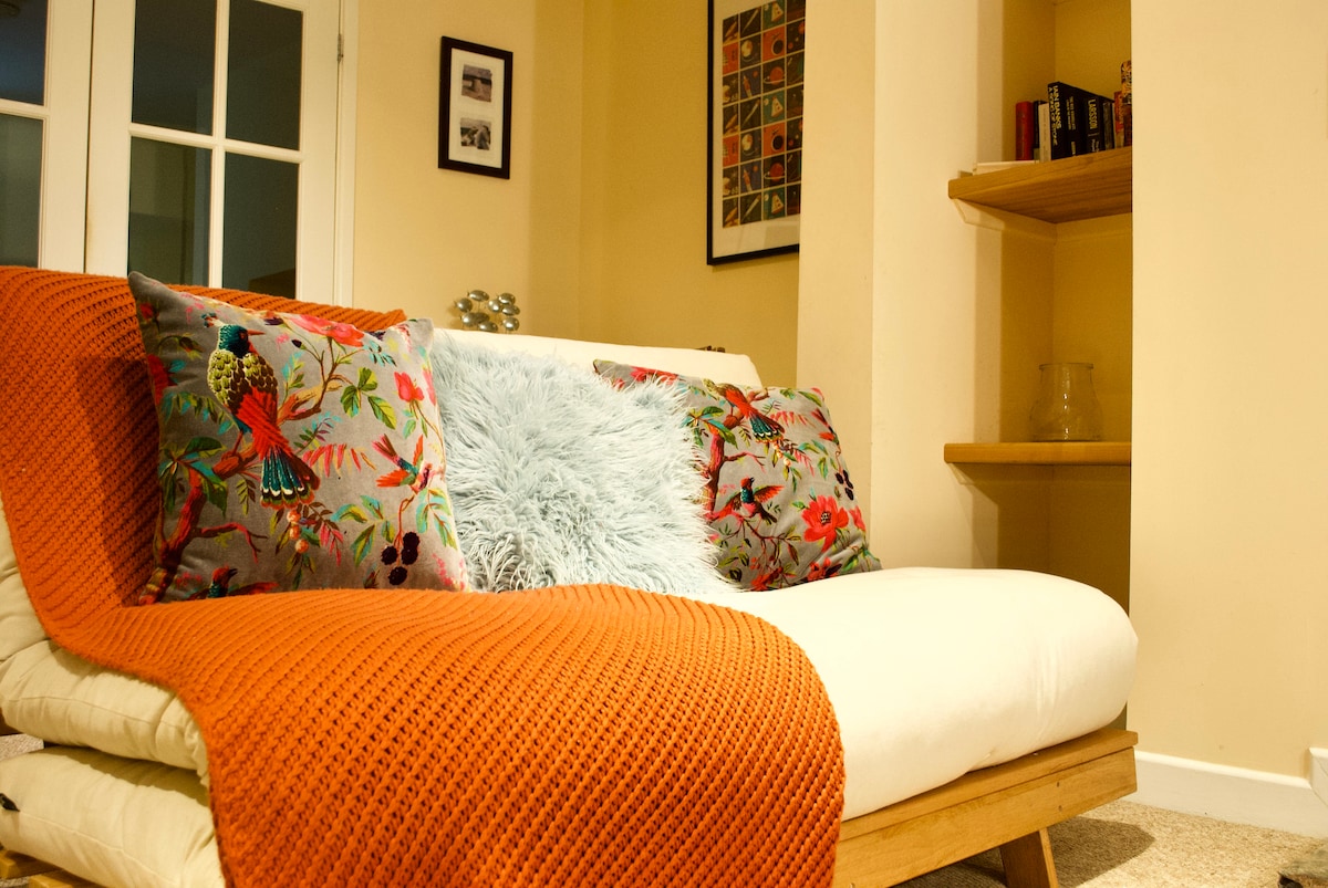 Un espacio tranquilo y privado dentro de una casa familiar con vistas al jardín y entrada independiente para que puedas entrar y salir cuando quieras. Vivimos en un barrio tranquilo con un lugar para aparcar tu coche. Todas las sábanas y toallas son de algodón de buena calidad. La cama es un sofá cama extra cómodo con un colchón suave y ropa de cama de algodón fresco. Cocina pequeña e instalaciones disponibles. El espacio es para viajeros solos o parejas, pero ten en cuenta que el acceso a la cama es solo desde un lado.