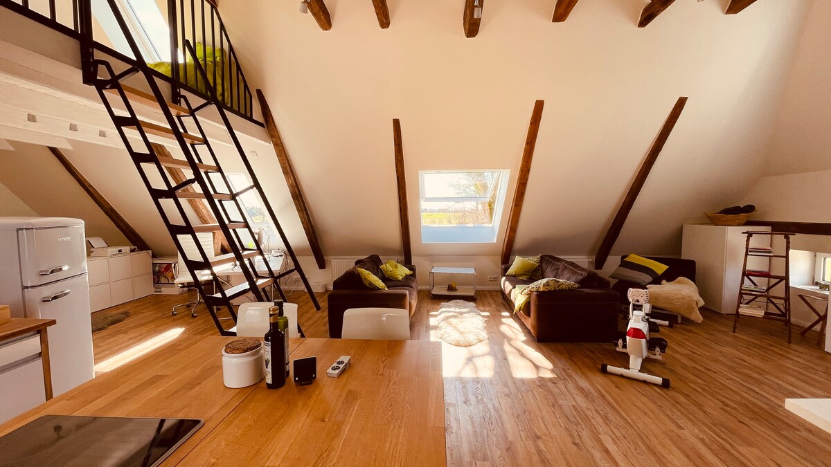 ¿Busca una combinación de trabajo y vacaciones? Bienvenido a la planta superior abierta de nuestra casa de campo reformada en una ubicación aislada en la reserva ornitológica en la frontera danesa… Gansos salvajes garantizados. Aquí arriba podrás desconectar. Solo tienes que subir y disfrutar de tiempo para ti solo o en pareja. Los perros también son bienvenidos: ¡espacio para jugar y naturaleza sin límites! Y la línea de fibra óptica de alta velocidad garantiza la mejor conexión a Internet. No necesitan traer muchas cosas. Todo ya está preparado.