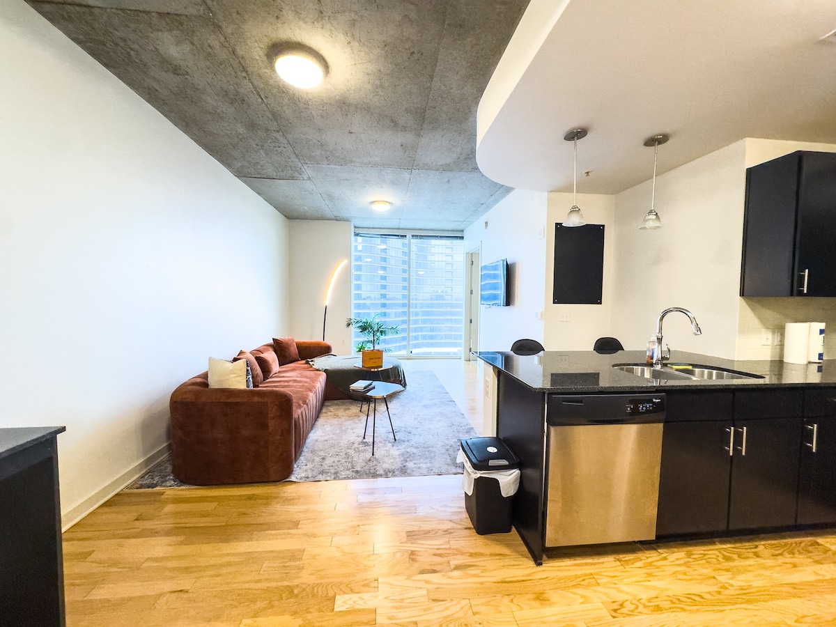 Stylish highrise in Midtown Atlanta, minutes from Mercedes Benz Stadium, State Farm Arena, Google, Whole Foods, 5 Star Restaurants, Coffee Shops, Parks, Georgia Aquarium, & Zoo Atlanta. A short drive to the airport, Six Flags, & Buckhead. The living room and bedroom have floor-to-ceiling windows for a bright, airy feel. The spacious bedroom features a queen-size bed and walk-in closet. The kitchen is fully equipped with modern appliances. The sleek bathroom offers a spa-like walk-in shower.