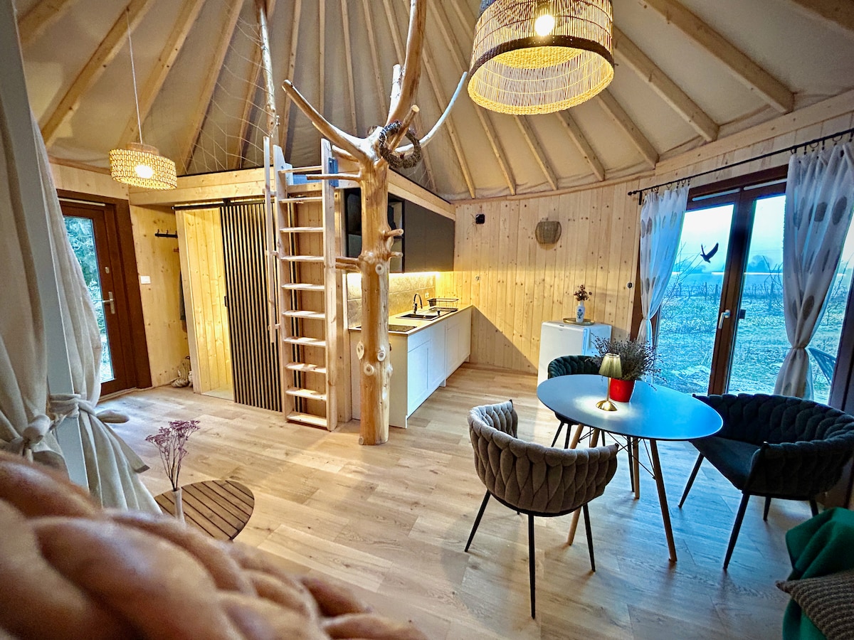 Całoroczna jurta o powierzchni 35 m², komfortowo przygotowana dla maksymalnie 4 osób. Ciepłe, przytulne wnętrze, pełne naturalnych materiałów, zapewnia wygodę zarówno latem, jak i zimą. To nie jest zwykły nocleg – to chwila prawdziwego spokoju. Idealna dla par i rodzin, które chcą odpocząć od miasta, nacieszyć się ciszą, naturą i wyjątkowym klimatem jurty. Jeśli szukasz miejsca, w którym można naprawdę zwolnić – jesteś we właściwym miejscu - Przybysławice koło Miechowa.