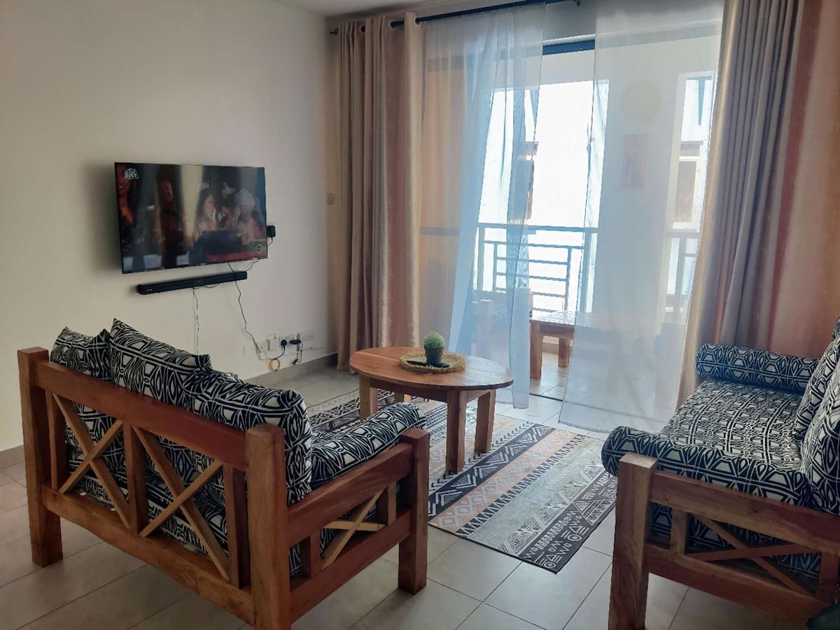 Acogedor apartamento estudio con servicios (Bamburi) amueblado. * Adecuado para 2 adultos y 1 niño o 3 adultos, amueblado con una cama tamaño queen y una cama individual. * Incluye aseo diario. * Mesa de comedor con cuatro sillas, sofá, mesa de centro. * Aire acondicionado *TV * Caja fuerte con llave * Balcón con dos sillas y mesa de centro * Cocina: nevera, microondas, hervidor de agua, cafetera, tostadora, vajilla y cubiertos. * Acceso a servicios: piscina, zona de juegos para niños, bar de playa, restaurante, gimnasio, playa, lavandería. * A 21 km del aeropuerto internacional de Moi. * A 26 km de SGR Mombasa.