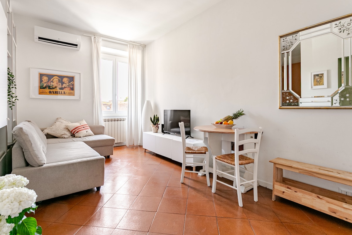 Elegante y luminoso departamento de 70 metros cuadrados, recientemente renovado y amueblado con muebles hechos a medida. Situado en un edificio tranquilo en el corazón de Trastevere, combina las comodidades modernas y el encanto romano. Tiene un dormitorio doble con una cama tamaño king de 180x200 cm, una gran sala de estar con un sofá cama y TV, una cocina moderna equipada, un estudio para trabajar a distancia, un baño con ducha y prácticos armarios.