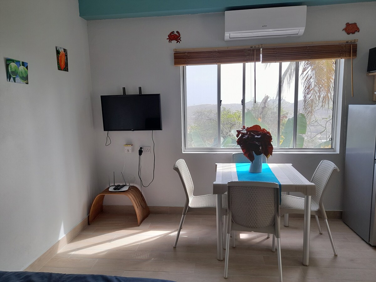 Es un nuevo apartamento de concepto abierto, sala de estar y comedor con una cocina bien equipada. A poca distancia se encuentran las exuberantes montañas verdes que crean un paisaje único. La sensación de aire fresco y fresco en este paraíso natural. Es tu casa de destino. Es muy bueno para parejas, solteros, familias y viajeros de negocios. Los huéspedes pueden estar en la hermosa playa de Grand Anse en 15 minutos. También hay traslado desde el aeropuerto disponible, así como servicio de taxi a las áreas de interés.