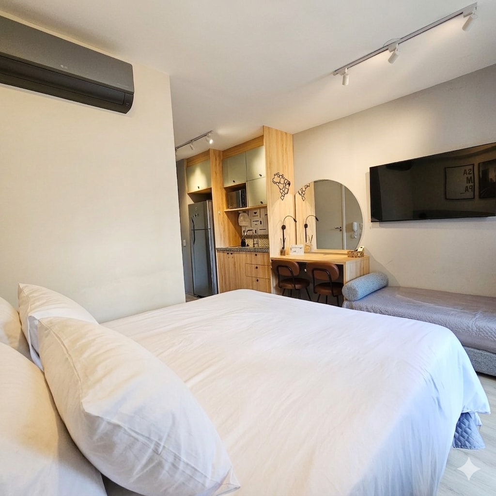Loft novo, decorado com charme e elegância nas Perdizes. Quarto confortável e todo equipado com cama King Size, Geladeira, Fogão de Indução, Máquina de Lavar, Escritório com Internet Cabeada , TV 4K 55 Polegadas, Wi-Fi. 300m do Shopping Bourbon.
