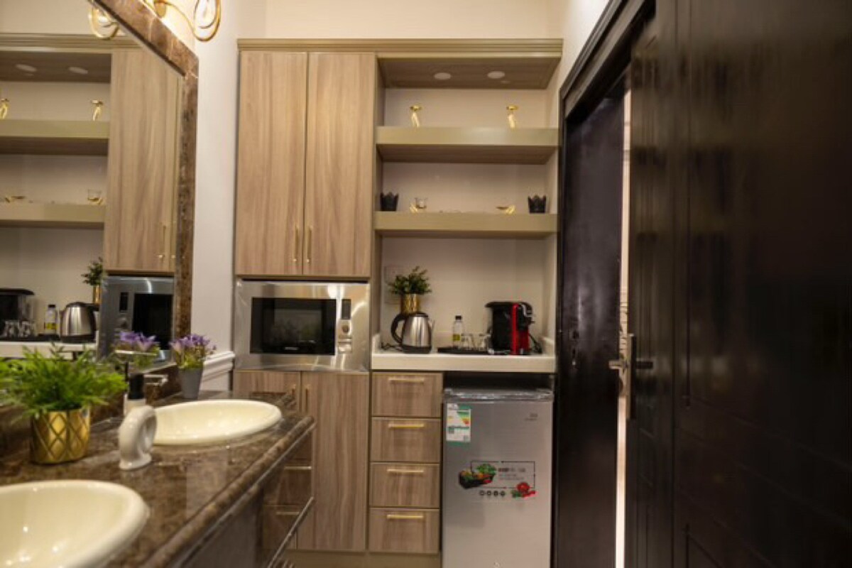 Una habitación de lujo con una cómoda cama principal, elegantes asientos, pantalla inteligente, baño privado y rincón de café.Cerca del santuario de La Meca y en una zona tranquila y segura junto a la mezquita de Al Rajhi, con fácil acceso a centros comerciales, restaurantes y la pasarela. Perfecto para descansar y disfrutar de la tranquilidad en los momentos más bonitos. Habitación de lujo con cama principal, asientos elegantes, TV inteligente, baño privado y rincón de café. Cerca de Al-Haram, en una zona tranquila y segura junto a la mezquita de Al-Rajhi, con acceso a centros comerciales, restaurantes y zonas peatonales. Perfecto para disfrutar de comodidad, relajación y estancias inolvidables.