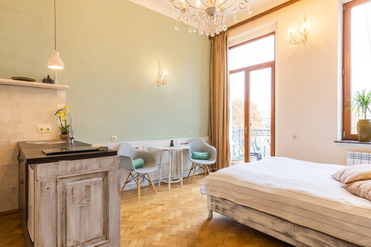 The one-bedroom apartment is a three-minute walk from Freedom Square and a stroll away from everywhere you would want to go: all the sightseeing sites, hidden gems, the trendiest restaurants, and bars, botanical garden, parks, and museums. Although at the heart of the Old Town bustle, the apartment has an entrance from a secluded street, maintaining a relative calm.