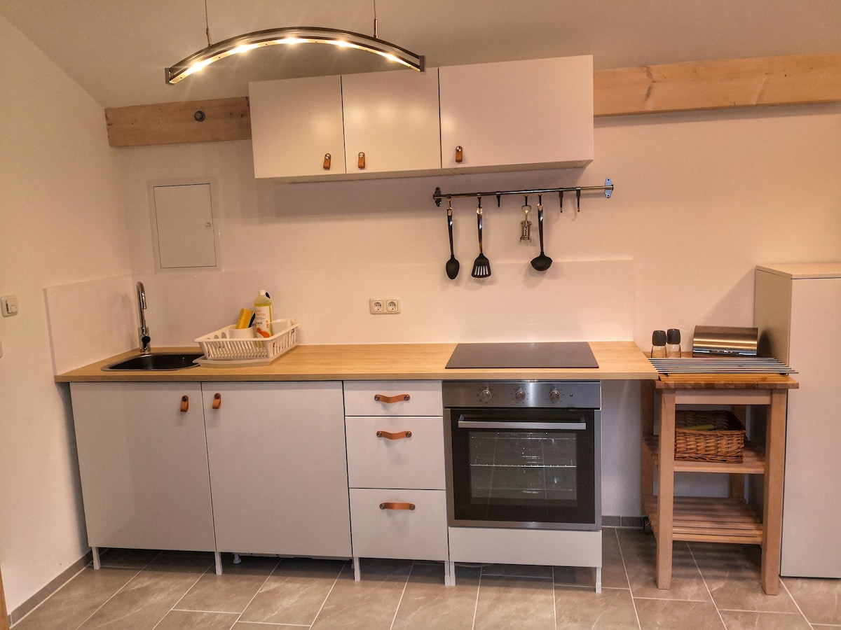 Ofrecemos un apartamento de 3,5 habitaciones en un ambiente confortable, adecuado como apartamento de vacaciones o de negocios (oficina en casa). Una gran cocina con sala de estar, un baño y 3 dormitorios en aprox. 100 metros cuadrados distribuidos en 2 plantas, mucho espacio para hasta 5 personas. También se podría alojar 1 niño pequeño. Un balcón orientado al sur completa el conjunto. Para la cocina hay una cocina moderna y bien equipada. Aparcamiento en la puerta.