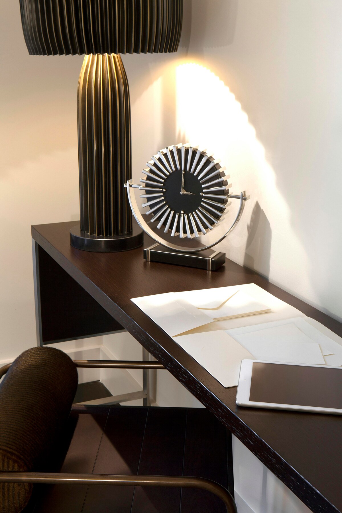 Habitación de hotel céntrica con muebles elegantes