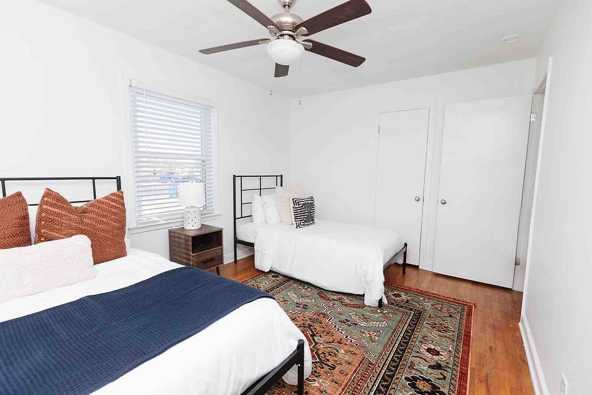 1 dormitorio con una cama tamaño Queen y una cama plegable doble. Este espacio es un apartamento privado en el sótano de mi casa con entrada independiente. Acceso exclusivo al salón, 1 dormitorio con cama tamaño queen, baño completo, zona de juegos con futbolín y mesas de ping pong, y cocina americana. Ubicado en 1 acre, por lo que es privado, pero aún en la ciudad. A 5 millas del centro y a 3 millas del área comercial. Ten en cuenta que, como este alojamiento se encuentra en mi casa familiar personal, solo recibiré a aquellos con reseñas positivas.