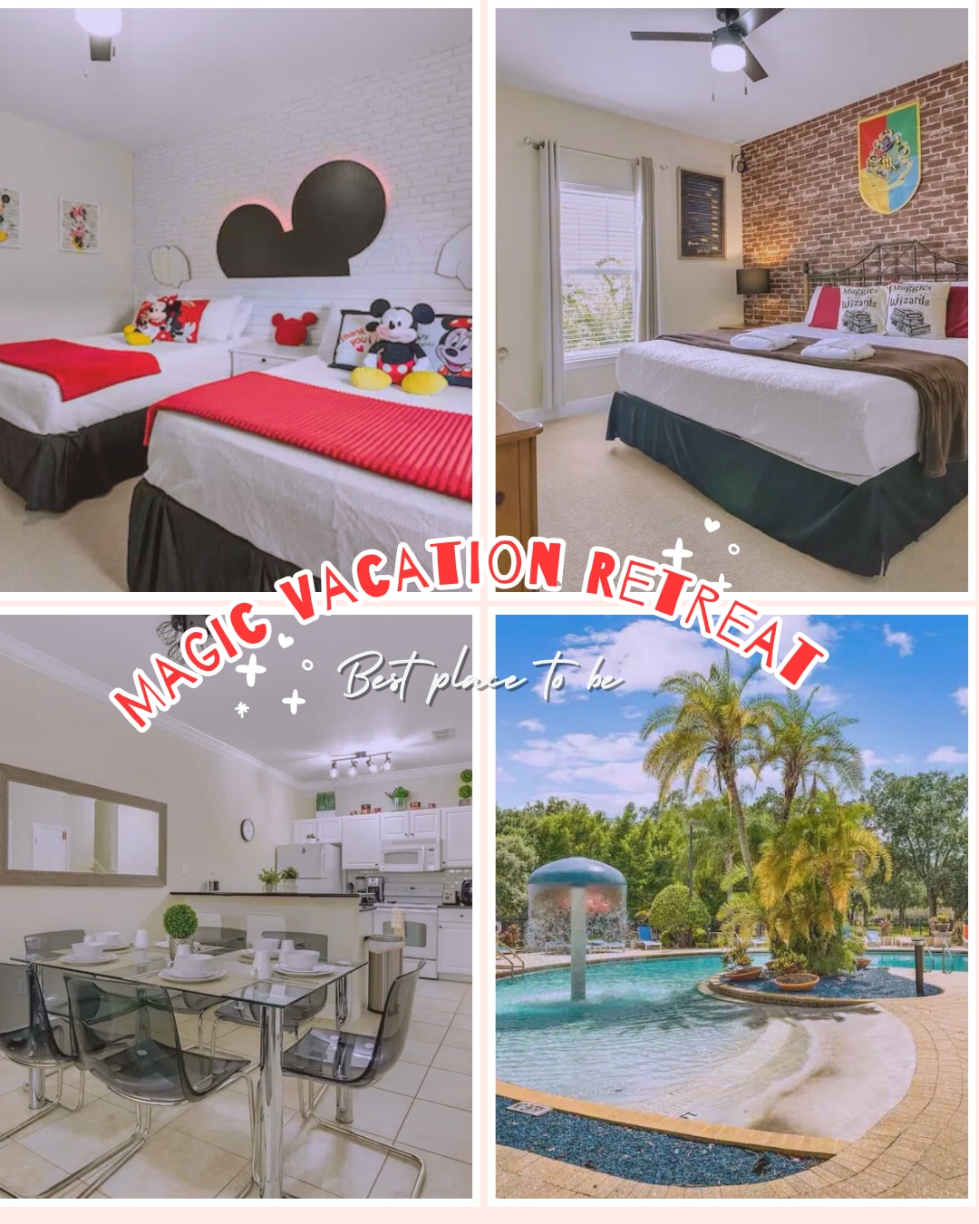Discover magic in our charming villa at Fantasy World Villas, near Disney, Universal & Sea World. Enjoy a whimsical Mickey & Minnie-themed room, king-size master bedroom, modern kitchen, and private patio. Resort: pools, slides, lazy river, kids' activities, gym, sports courts & more. Walk to shops & restaurants. Free WiFi, parking & resort access. Create unforgettable memories in our enchanting villa, just steps from theme parks & resort fun! Book now!
