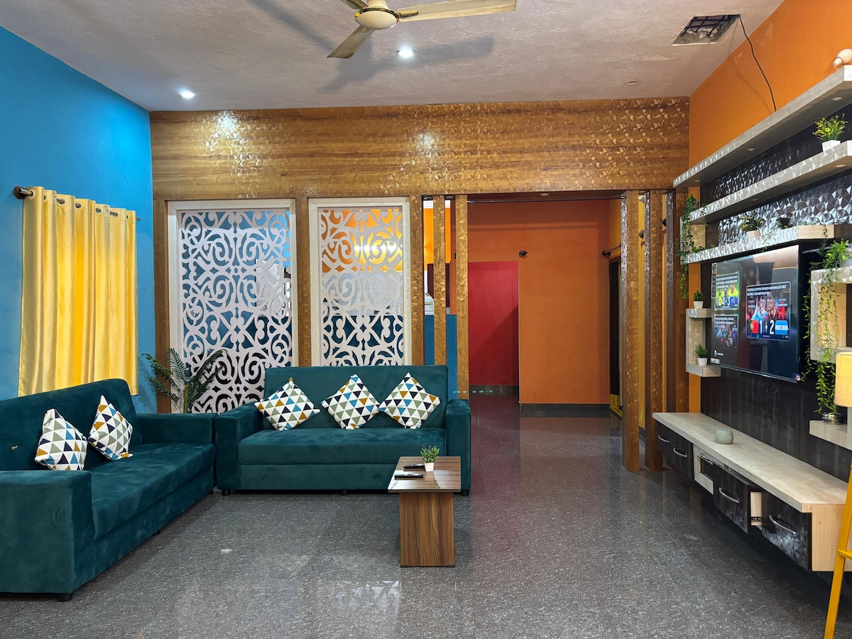 Adhyaya – Heritage Reverbed es una villa temática de 3500 pies cuadrados en Mysore, diseñada como un hogar lejos de casa para familias y grupos muy unidos. Con 4 elegantes dormitorios, amplias salas de estar, una cocina totalmente equipada y un balcón abierto con encanto de terraza, combina la elegancia del viejo mundo con comodidades modernas como el entretenimiento Ott. Idealmente ubicado a pocos minutos de las principales atracciones de Mysore, es perfecto para un máximo de 12 adultos y 4 niños.