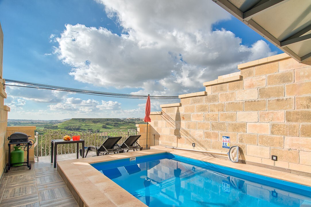 Escápate al tranquilo entorno de Gozo en nuestra casa de vacaciones premium de 3 plantas con inmejorables vistas al mar Mediterráneo y puestas de sol sobre un auténtico pueblo gozitano. Los huéspedes disfrutan del uso privado de la increíble terraza en la azotea con una piscina de borde de vidrio y barbacoa/comedor al aire libre. El interior de diseño está equipado con cocina completa, TV inteligente 4K, aire acondicionado en todas las habitaciones y wifi. La tranquila ubicación está a solo 5 minutos a pie de la bahía de San Blas y a 7 minutos en coche de la arena de la bahía Ramla.