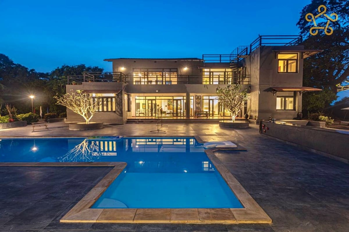 Casa de campo rústica y elegante con una gran piscina en Alibaug