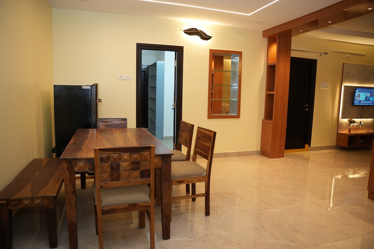 ¡Nuestra propiedad es lujosa, aislada y a solo 5 minutos de Hi-Tech City! Este apartamento dúplex en los pisos 4.º y 5.º es perfecto para: - Grupo de amigos (hasta 16 personas), compañeros de trabajo o familias que celebran una ocasión especial en el césped. - Equipos corporativos que necesitan estaciones de trabajo, wifi rápido y energía de respaldo - NRI, turistas e invitados a bodas que buscan un segundo hogar con SERVICIO DE LIMPIEZA, cocina completa y comodidades modernas. - Parejas que necesitan una escapada para relajarse frente a un televisor inteligente 4K de 55 pulgadas.
