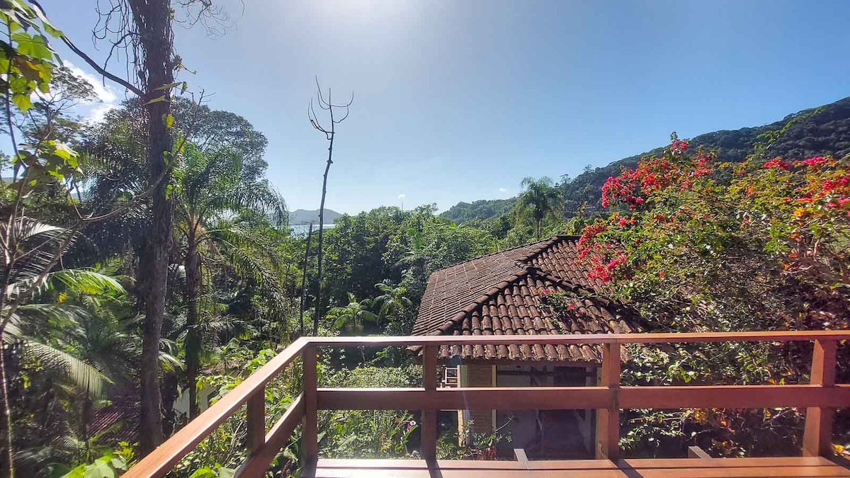 Vista fabulosa para montanhas e mar, ela está à 10 min da praia. Acomoda 10 pessoas, com todas as áreas exclusivas para os hóspedes. Oferece roupas de cama e banho, cadeiras de praia, cooler e guarda-sol. Ambiente tranquilo com segurança 24h. Ideal para estadias curtas ou longas, ótima internet com espaço para home office combinando produtividade e bem estar. Desfrute da experiência de estar em meio à natureza. A casa é pet friendly.