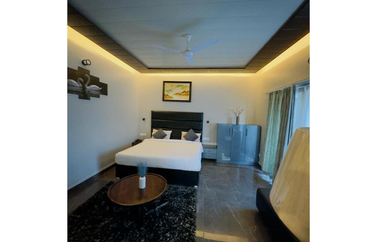 Acogedora habitación con comedor, restaurante y acceso a la piscina. Relájate en esta serena y cómoda habitación privada situada en las colinas de Bhimtal. Ideal para parejas, viajeros solitarios o familias pequeñas, la habitación ofrece un refugio tranquilo rodeado de naturaleza. Disfruta de acceso a un hermoso comedor compartido, un restaurante en el lugar que sirve comidas locales y de múltiples cocinas, y una piscina resplandeciente para relajarse y tomar el sol.