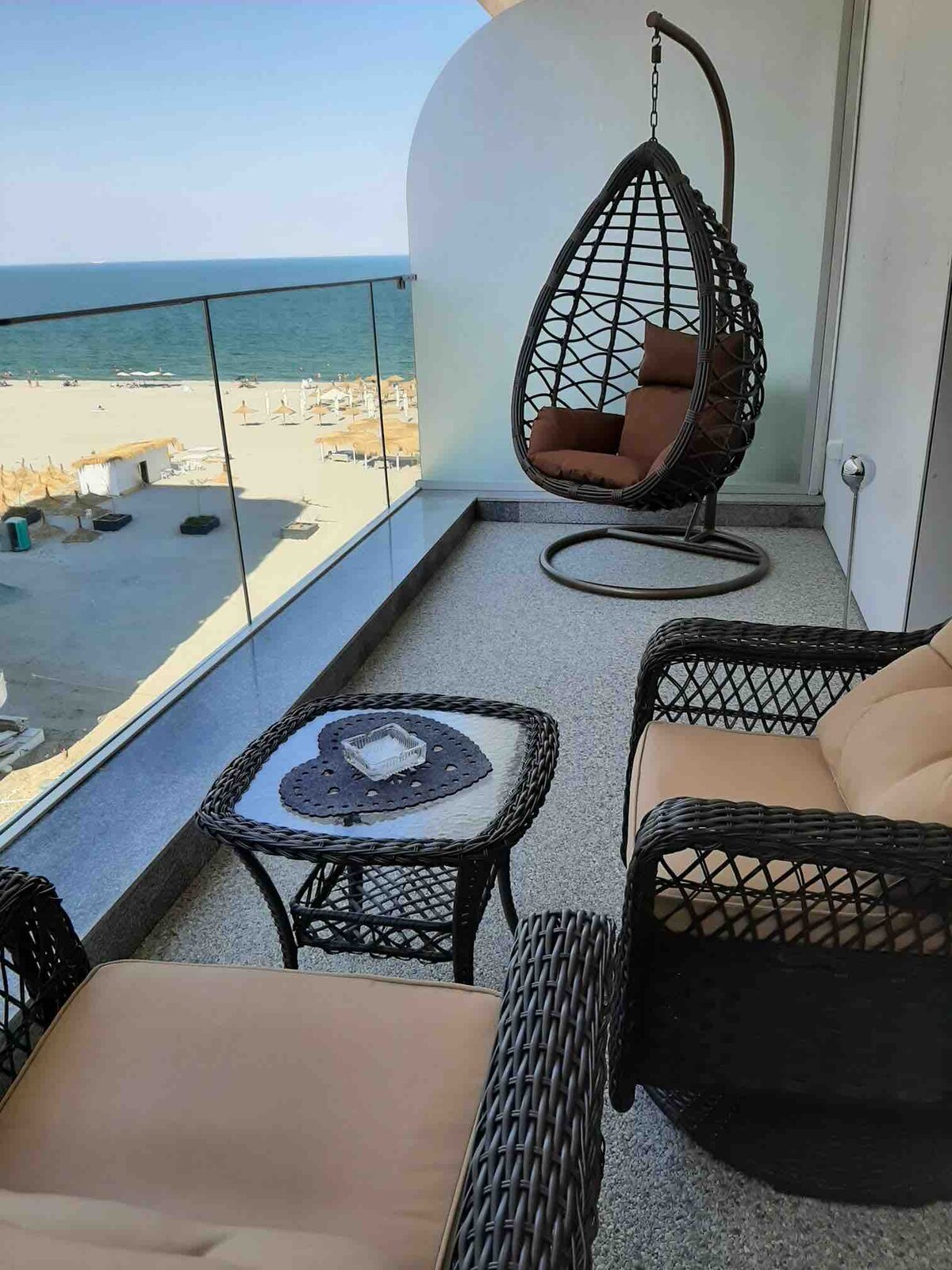 Enjoy a stylish experience in this home, located on the shores of the Black Sea in the first line at the beach! Live your vacation in a refined and relaxing style! In the evening, from the terrace you can hear the sound of the waves hitting the shore! In this area, the beach is fine sand, has not been widened and the entrance to the water is smooth, suitable and safe for children and adults, and the bathing area up to the buoy is about 40m. There are plenty of shops and restaurants nearby .
