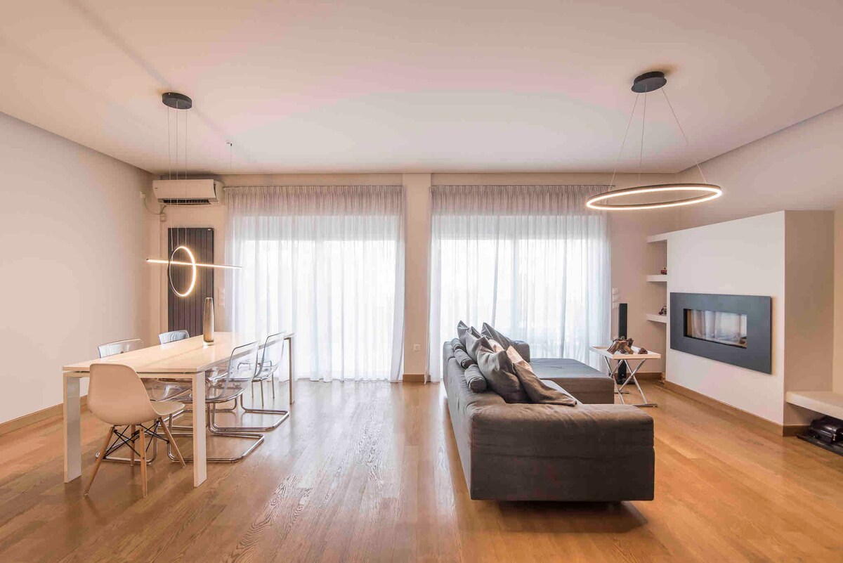 Disfruta de un nuevo apartamento (2021) tranquilo y céntrico en el distrito de negocios de Marousi con vistas a la naturaleza y aparcamiento gratuito cerca de hospitales (Ygeia, Mhtera, Centro Médico de Atenas y Iaso), el Estadio Olímpico OAKA de Atenas, a poca distancia a pie del centro comercial Golden Hall, restaurantes, supermercado y metro Kifisias.