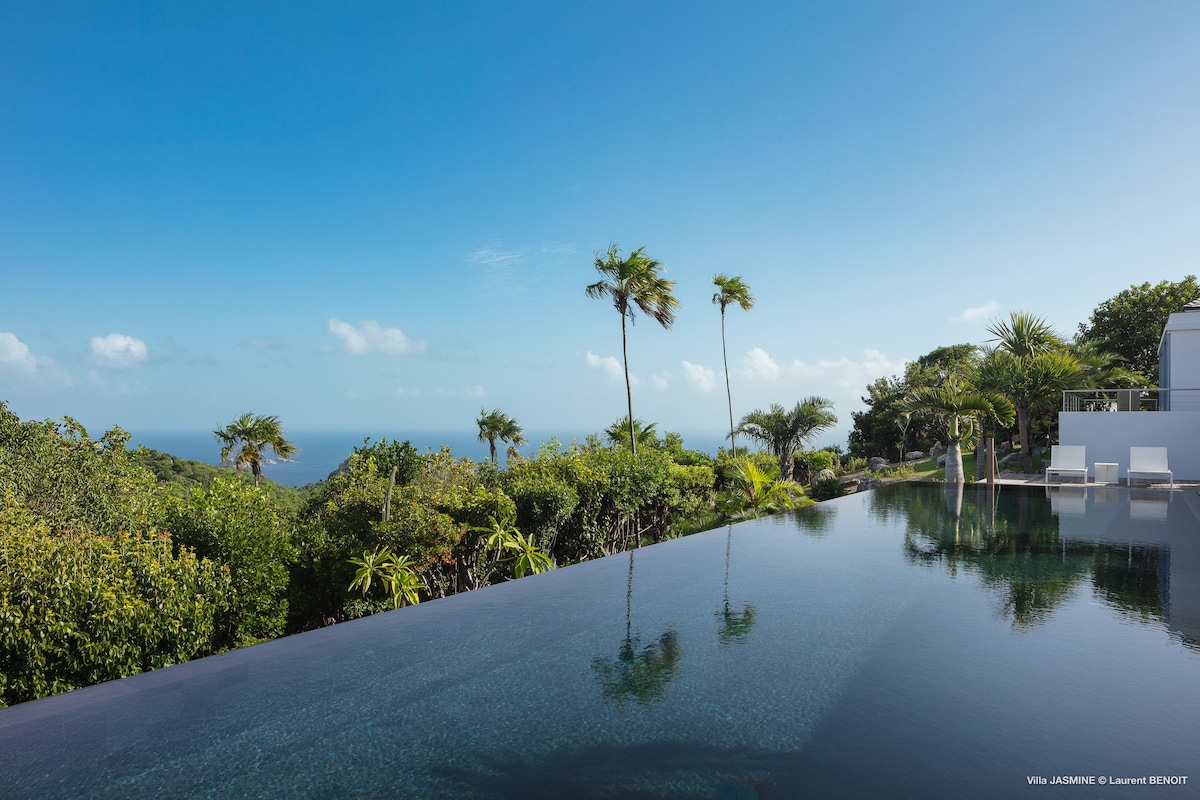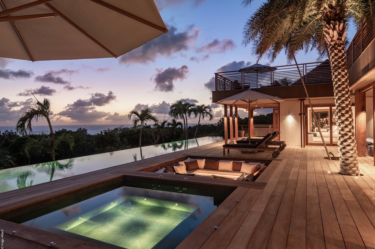 Cerulean sea foams below this pair of neighboring villas perched above Anse des Lézards. Les Lataniers comprises of an infinity pool and jacuzzi with Lo Scoglio having its own pool, all with sea views. In both villas, breezy and light are the watchwords, achieved by fold-away glass and open-sided living areas. It’s a short drive or slightly longer walk to beaches like Anse des Cayes, bakeries, and eateries. The estate accomodates for a total of 20 guests.