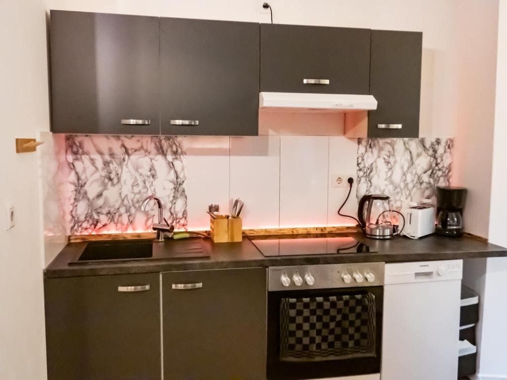 Ofrecemos un apartamento en un edificio antiguo totalmente modernizado en el corazón de Neuss con dos dormitorios (140 x 200 y 180 x 200 ampliables por dos 90 x 200 especialmente para familias con niños), un salón con cocina contigua totalmente equipada y un baño con ducha de efecto lluvia. Hay una lavadora y secadora disponibles. La ventilación de confort proporciona aire fresco en todas las habitaciones. En invierno, se utiliza la calefacción por suelo radiante. Wifi gratuito disponible.