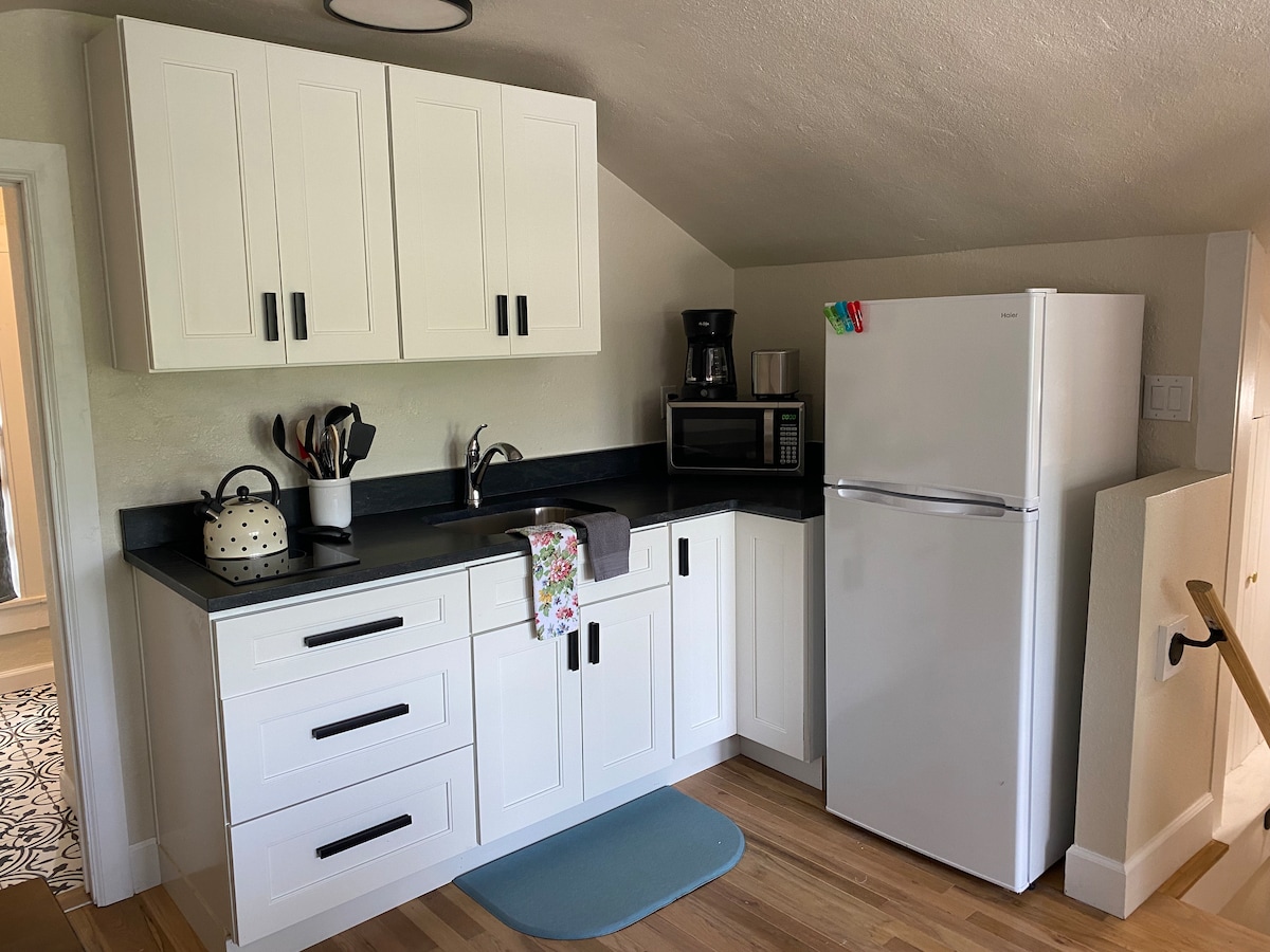 Disfrute de este mini-estudio cómodamente equipado con cama king size, baño grande con bañera y ducha de azulejos, cocina comedor, además de mini-nevera, fregadero, microondas y cafetera. Como se agregó, además, siéntate afuera en la pequeña terraza y disfruta de lo mejor de Ruidoso. Hay una pequeña zona vallada de forma completa y segura para que tu compañero de viaje con un perro pequeño. ¡Este gran escondite está a solo unos pasos del centro del distrito a pie del centro de Ruidoso lleno de tiendas, restaurantes, galerías y vida nocturna!