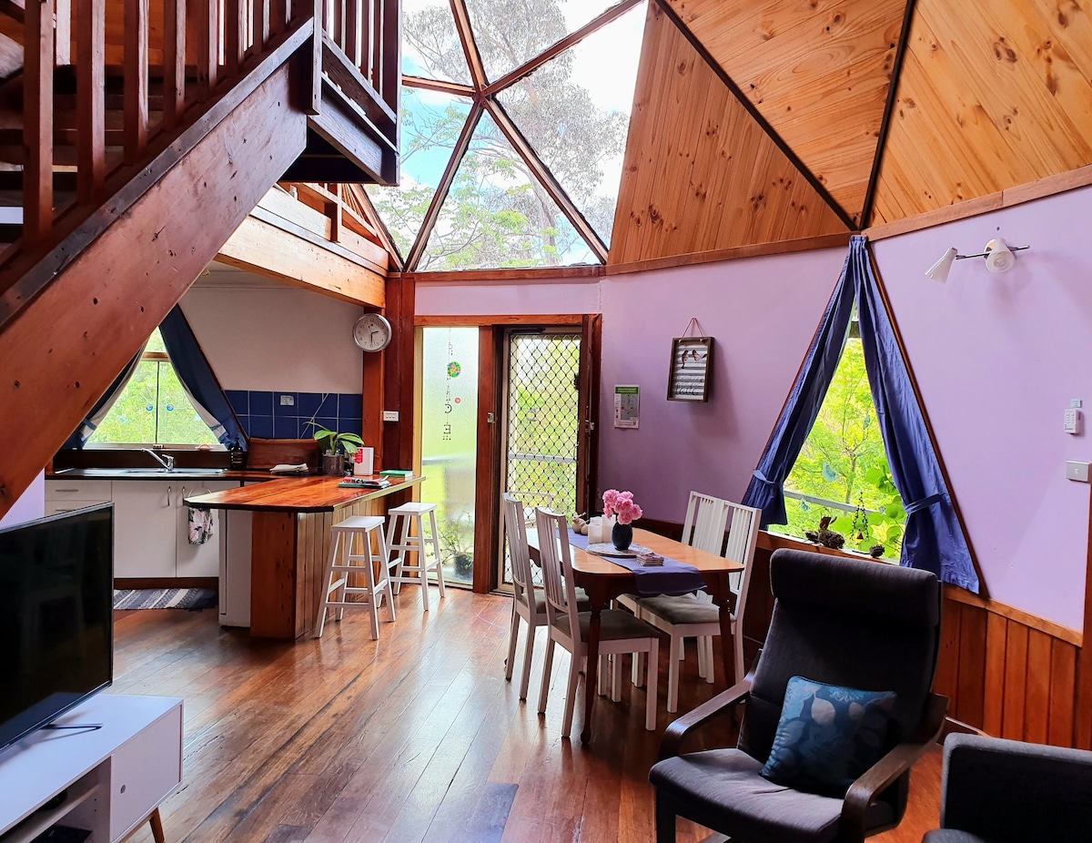 Disfruta de una experiencia única y memorable alojándote en una cúpula geodésica espaciosa y llena de luz. ¡Observa las estrellas por la noche o el amanecer por la mañana desde el salón o el dormitorio! Arquitectura única, ubicación tranquila. 2 dormitorios, 1 baño, capacidad para alojar a 6 huéspedes. La propiedad no es apta para niños menores de 7 años. Ubicado en 1/2 acre con jardines, aparcamiento disponible en el lugar. A 15 minutos a pie de la estación de tren. A 5 minutos en coche de Wentworth Falls, a 10-15 minutos de las 3 Hermanas y de los sitios de Leura y Katoomba.
