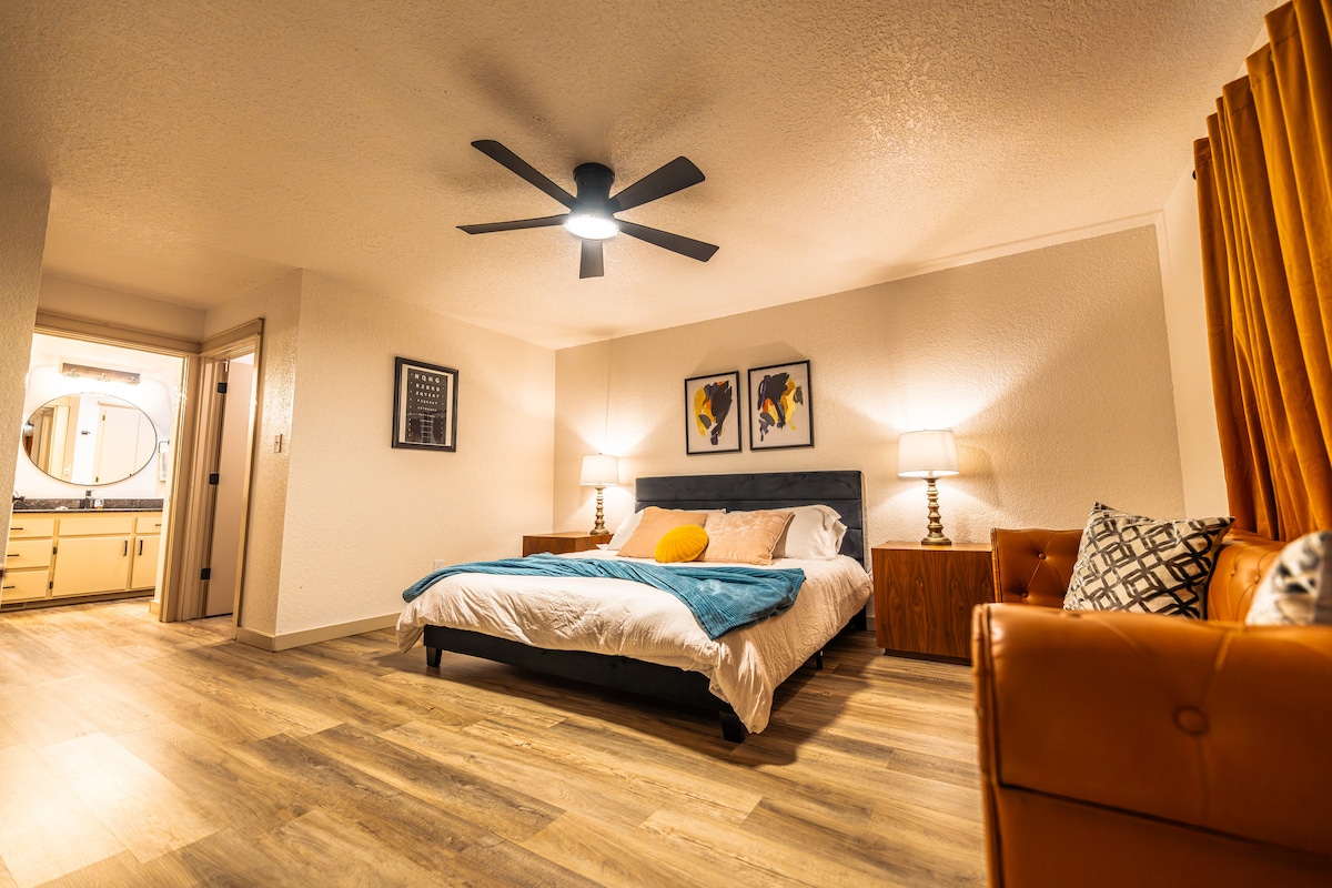 THIS IS A DUPLEX. Very quiet 3 bed 2 full bath offers unique private front courtyard, and back outdoor living room with TV & grill. Modern interior filled with art. Open living/dining/kitchen. Primary bedroom suite features KING size bed, 55” Smart TV, and spacious bathroom with walk-in shower. Secondary bedroom features KING size bed and TV. Perfect location minutes to restaurants and shopping. Out of town guests only. Easy access to all major interstates. Pets allowed ($40 per stay. )