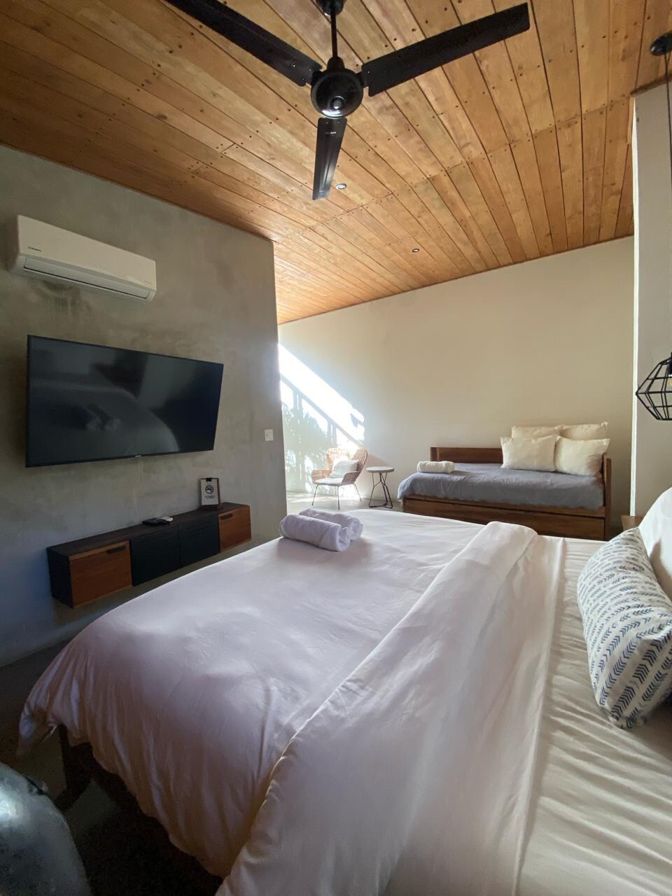 This newly remodeled studio offers a cozy stay for up to 2 people. It is located at the new La Joya commercial area in the middle of the eco casita phase 1 development within Hacienda Iguana. The unit is equipped with a small kitchen and office area. There is an air conditioning unit and fan in the living room and bedroom areas. We have a 55'' smart tv, and our WiFi is reliable. - 4 seater golf cart rental is available @ $50/day.
