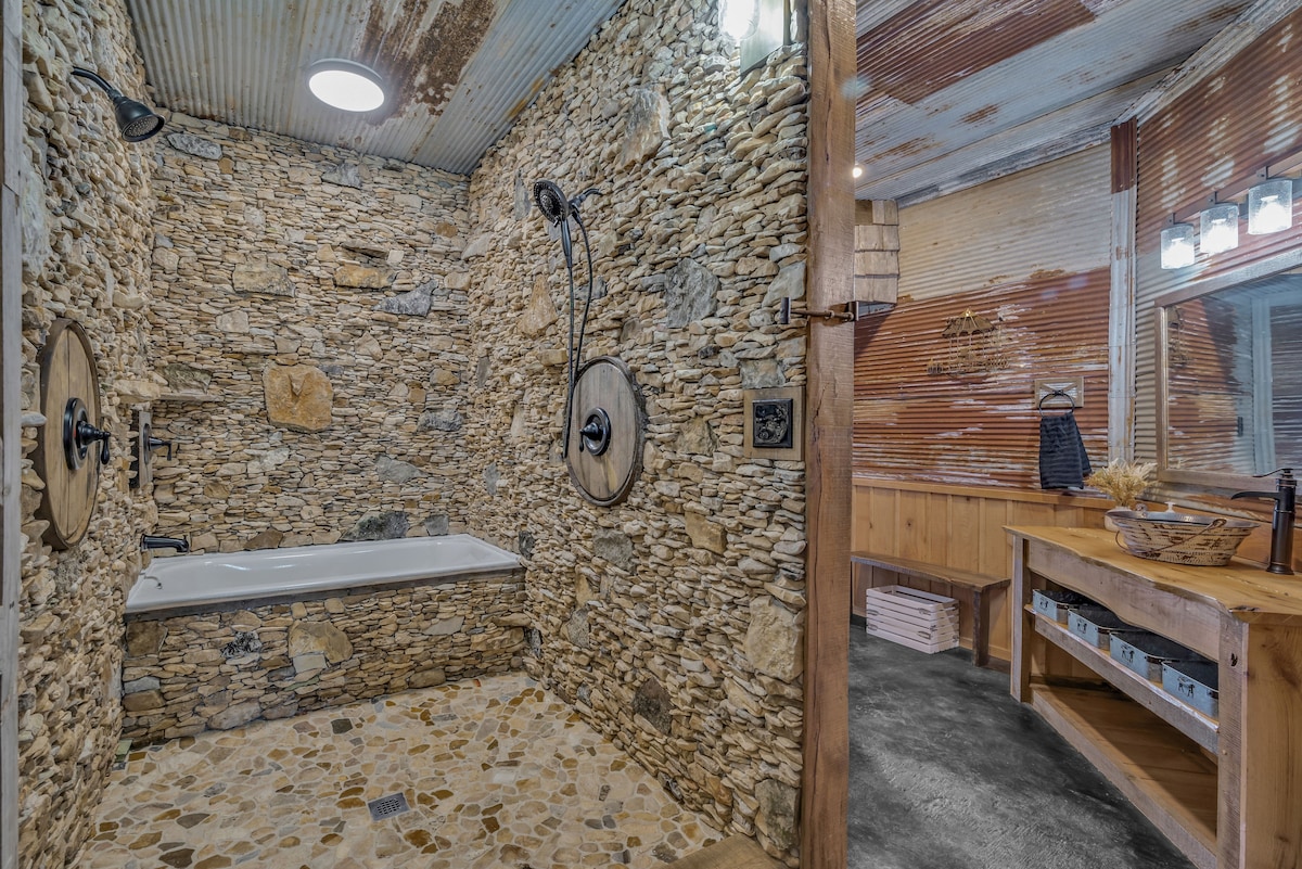 Esta casa fue construida con maderas recuperadas de la zona local. La casa tiene un techo alto abierto y una escalera de madera al balcón, suelos de roble personalizados (también hechos de madera recuperada). La cama principal se completa con un baño principal con una gran ducha de roca que se hizo con piedras de arroyos locales. Arriba tiene una cama tamaño king, cine de 120 pulgadas, asientos adicionales. El porche trasero de cuerpo entero conduce al jacuzzi. Realmente es único.