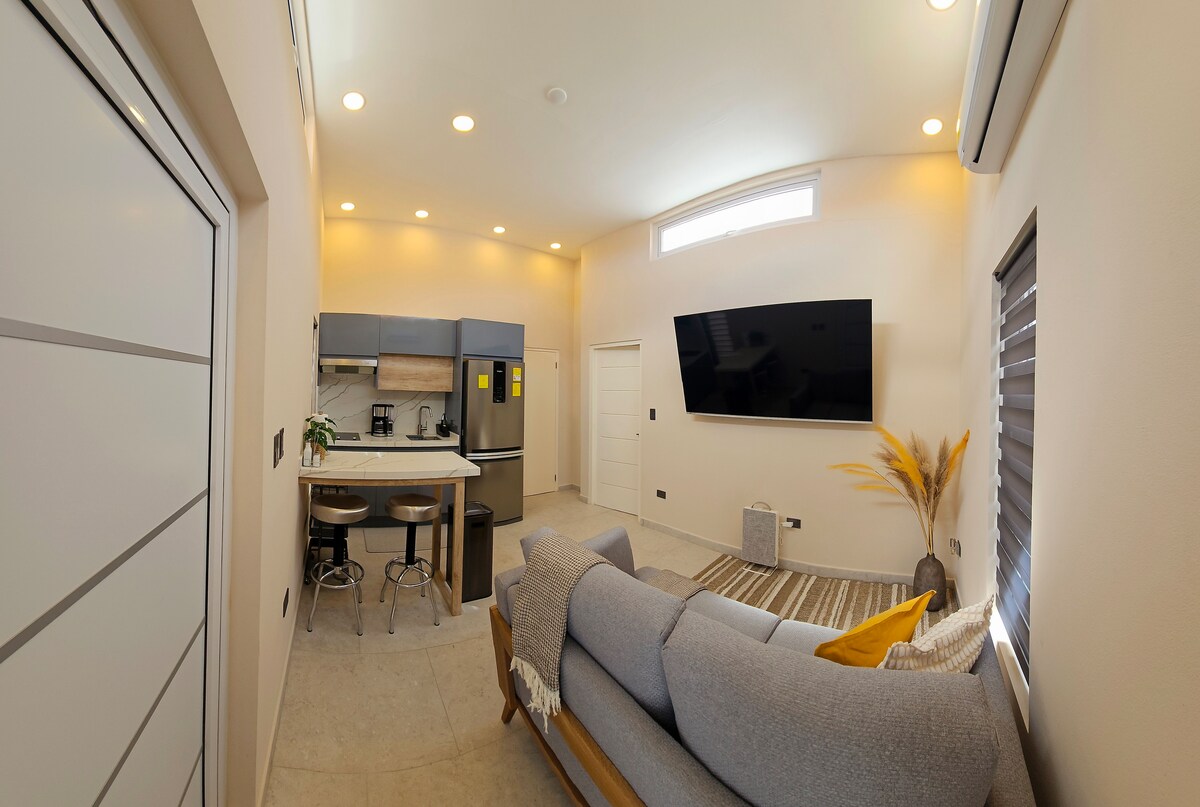 ¡Bienvenido a nuestro encantador apartamento para huéspedes! Este cómodo estudio con refugio cuenta con una cómoda cama tamaño queen, ideal para una noche de descanso tranquilo, mientras que un sofá plegable proporciona un espacio cómodo para tu pequeño. Nuestra moderna cocina está totalmente equipada con comodidades contemporáneas que incluyen microondas, cafetera y refrigerador. Incluso incluimos una pequeña lavadora, para garantizar que tu estadía sea tan conveniente como cómoda.