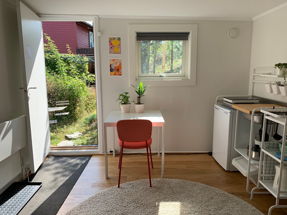Apartamento recientemente renovado con puerta de entrada privada en una casa para dos familias. Salón combinado de 20 m2/nueva cocina + 10 m2 de dormitorio separado con una cama doble de 180x200 cm y armario. Baño con inodoro y ducha. A solo 5 minutos a pie del autobús que te lleva a la estación central de Oslo en 15 minutos. A 15 minutos a pie del fiordo de Oslo con playa y senderos para caminar. Check-in con caja de llaves. El apartamento tiene una amplia vista hacia el bosque